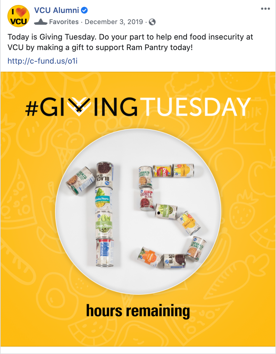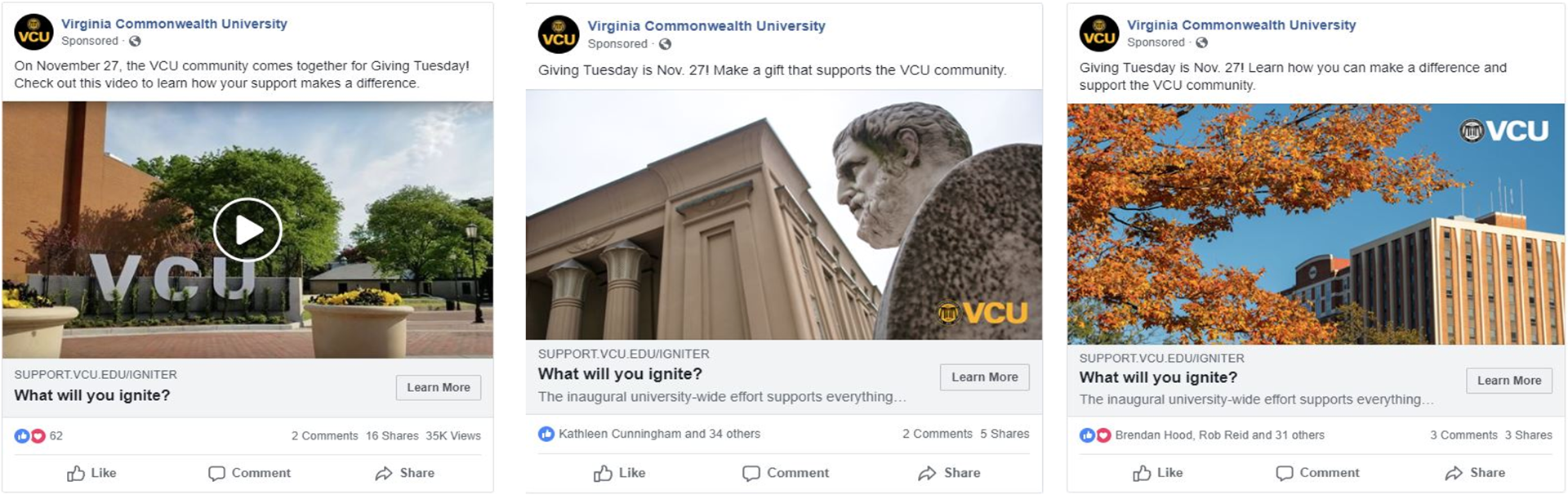 Virginia Commonwealth University embarked on its first Giving Tuesday effort Nov. 27, 2018. To make sure the campaign was a success, we launched a complex and comprehensive social media effort from the primary university Facebook and VCU Alumni channels.